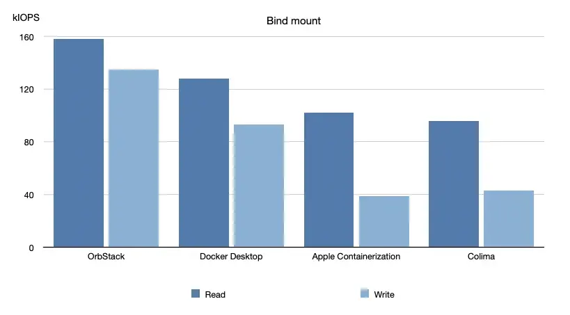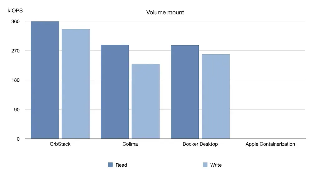 Volume Mount の場合は、OrbStack が Read / Write ともに他より性能が高いという結果になった。Docker Desktop と Colima は、Write が若干 Docker Desktop のほうが速いが、Read はほぼ同じ速度だった。なお、Apple Containerization にはまだ Volume を作成する機能がないので、こちらは測定できなかった。
