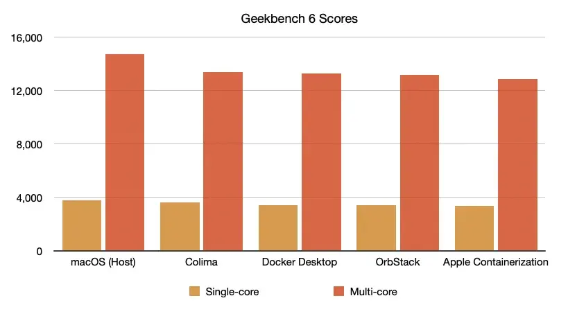※各コンテナ環境には8CPUコアを割り当てており、macOSホストは10CPUコア全てを使用可能なので、Multi-coreに関してホストOSとの直接比較はできないので参考まで。