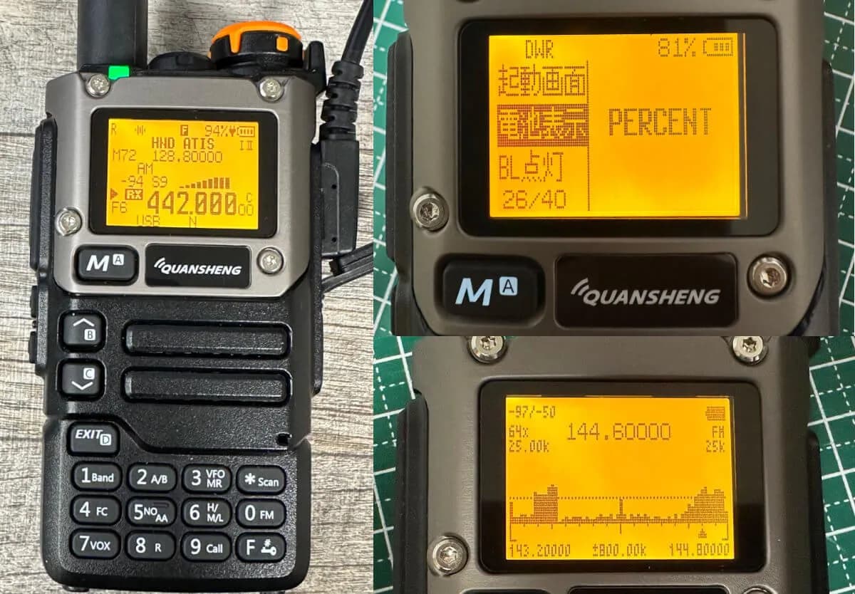 F + 1:VFOモードで1000MHz切替、メモリーモード時はVFOにコピーF + 2:A/Bチャンネル切替F + 3:VFO/メモリーモード切替F + 4:周波数カウンタ/CTCSS/DCSスキャンF + 5:スペアナ表示F + 6:帯域幅を変更F + 9:ワンキーチャンネル呼び出しF + 0:FMラジオF + *:スキャン実行